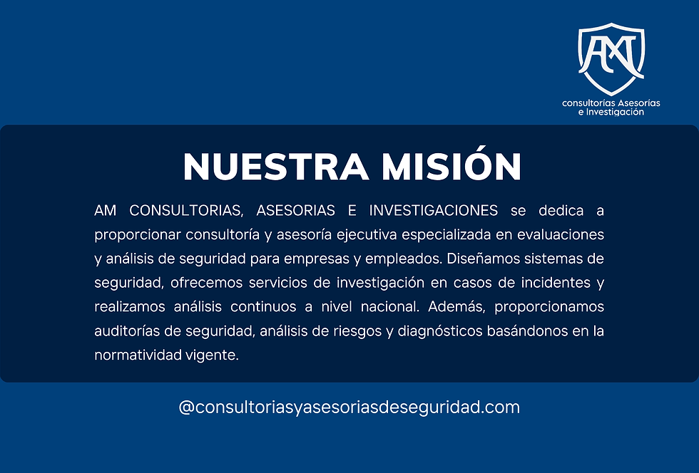 AM CONSULTORIAS, ASESORIAS E INVESTIGACIONES se dedica a proporcionar consultoría y asesoría ejecutiva especializada en evaluaciones y análisis de seguridad para empresas y empleados. Diseñamos sistemas de seguridad, ofrecemos servicios de investigación en casos de incidentes y realizamos análisis continuos a nivel nacional. Además, proporcionamos auditorías de seguridad, análisis de riesgos y diagnósticos basándonos en la normatividad vigente.